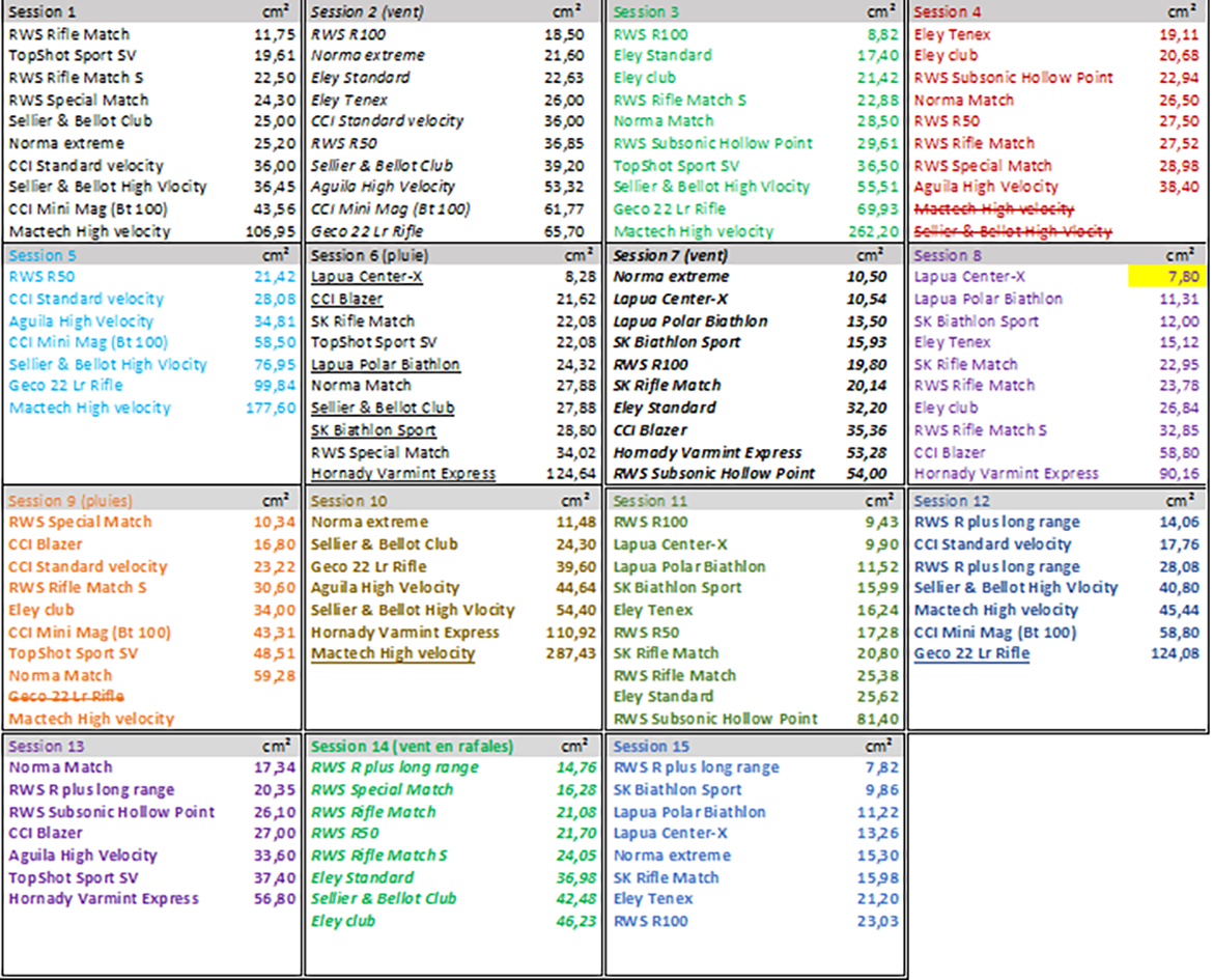 Dans les séances, entre sept et dix références différentes de 10 cartouches de même référence ont été tirées sur une cible, lors de deux séances, des mélanges d’impacts ont annulé la mesure des deux références. Les différentes références de cartouche n’ont pas été tirées dans le même ordre de tir lors des différentes séances.