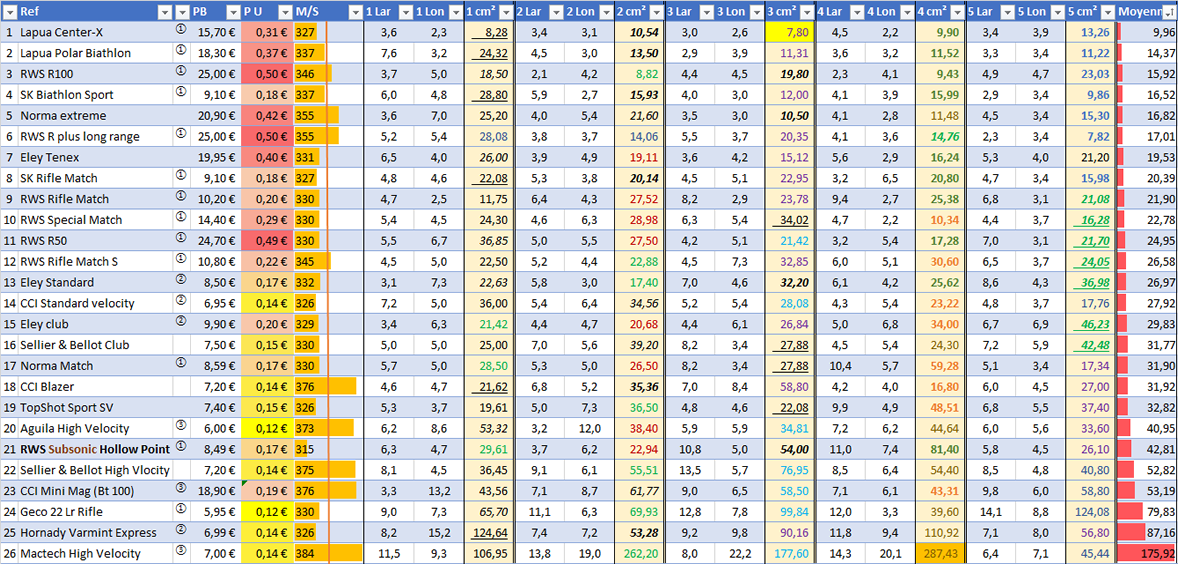 Au vu des résultats des Lapua et SK du 1er test, j’ai rajouté pour ce test la munition : Lapua long range, ce qui porte à 27 le nombre de référence testé.