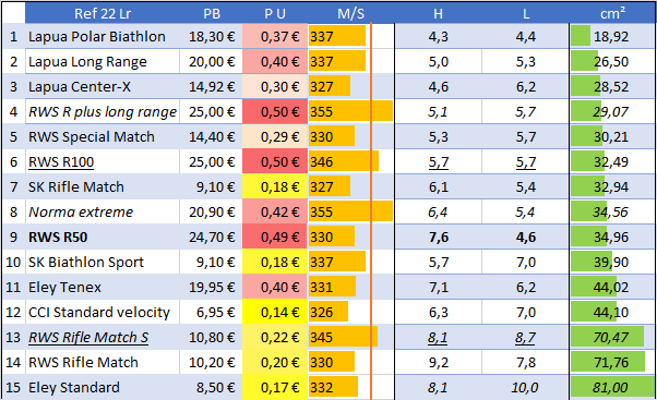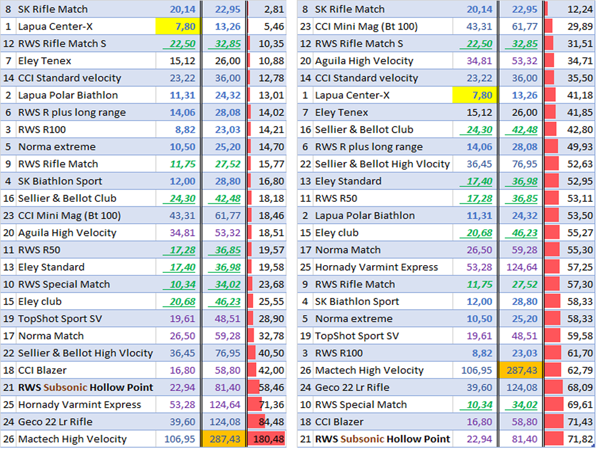 En exemple la SK Rifle Match qui a la meilleure stabilité de cartouches, a l’écart le plus faible en cm² et % mais 8ème dans le résultat global, ou la Mactech high Velocity dernière du résultat global et en cm², mais 22èmes en % du fait de l’éparpillement constant des impacts lors des 5 tirs.